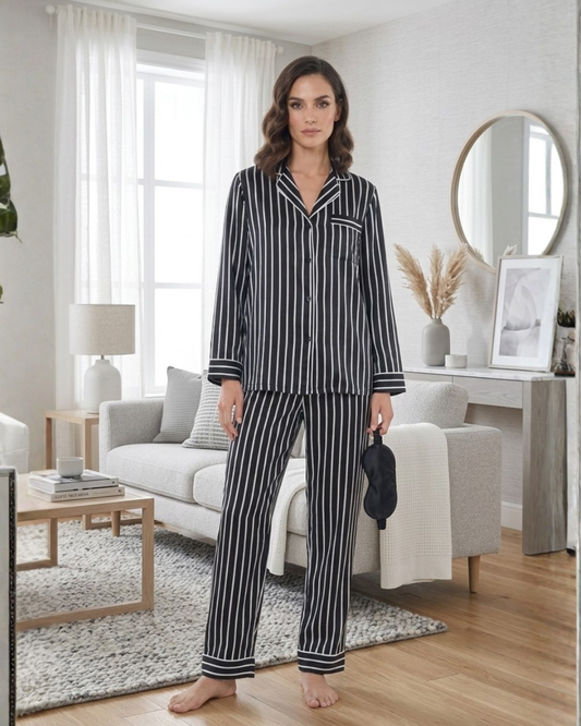 Art. 57060302 Pijama Camisero Liso Negro en SATÉN